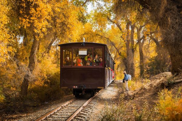 核心玩法:乘坐小火车穿越胡杨林(全程约10公里,沿途停靠多个观景台,沉浸式感受金黄秘境),拍摄胡杨倒影(河边机位最佳,清晨或黄昏光线最出片),徒步深入林间(小众机位,避开人群)。