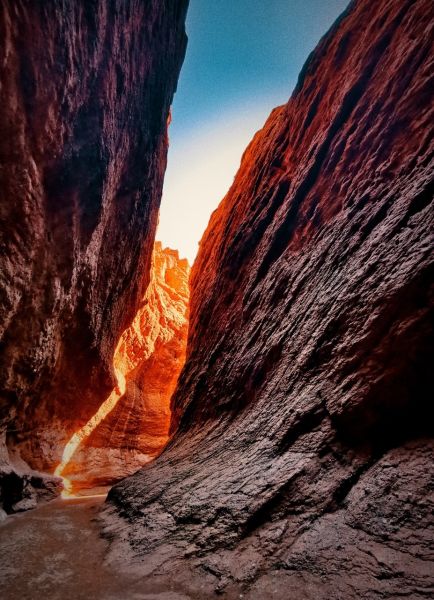 位于库车市附近,是天山南麓的丹霞地貌峡谷,整条峡谷呈红褐色,谷道蜿蜒曲折,最窄处仅容一人通过,阳光透过谷顶缝隙洒下,光影交错,宛如神秘的秘境。