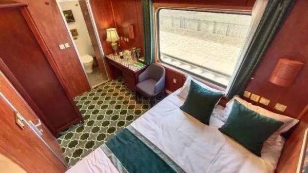 - 车厢配置:共12节车厢(8节卧铺+4节功能车厢),车体为2023年全新采购,内饰简洁大气。房型有商务单间(20㎡,独立卫浴、mini吧台(免费提供矿泉水、新疆特色干果)、全景观景窗(可开启通风))、商务标间(18㎡,独卫/公卫可选,独卫配备电热水器)、四人软卧(每铺配备遮光帘、小桌板)、平铺双人间(无上下铺,床垫厚度15cm,便于老人起身活动),所有房型均有USB充电口(每铺2个,含快充功能)、床头阅读灯(可调节亮度),走廊铺手工羊毛地毯(防滑静音),每节车厢角落配备垃圾桶、消毒湿巾,氛围温馨又整洁。